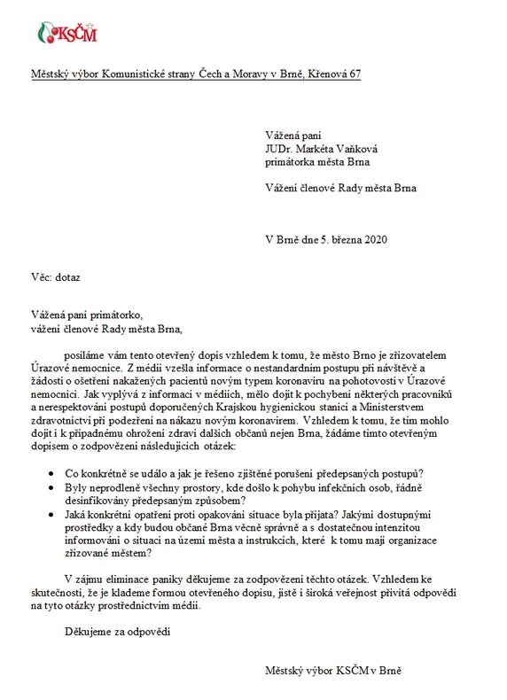 BRNO: V otevřeném dopisu komunisté po primátorce Brna Markétě Vaňkové požadují odpovědi na otázky týkající se postupu Úrazové nemocnice v souvislosti s koronavirem. Dopis dnes Vaňkové doručili členové Městského výboru KSČM. Média o tom informoval mluvčí brněnských komunistů Aleš Růčka.